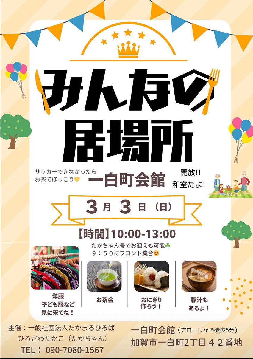 たかまるひろば主催のイベント告知チラシ 日時は3/15・3/18・3/22 イベント名はおゆずり会 会場は教育総合支援センター 加賀市三木町二番93-1 子どもたちの洋服や学用品ありまーす!見に来てね